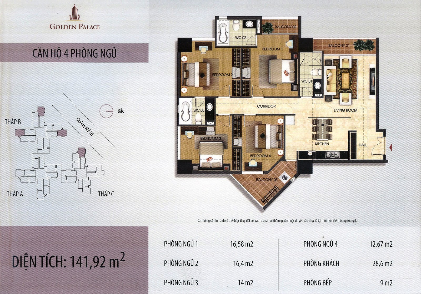 - Căn hộ 4 phòng ngủ: 141.92 m2; 162.32 m21